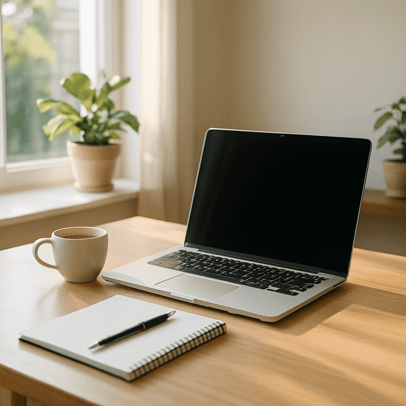 Prompt: A photorealistic image of a clean, minimalist workspace with a laptop, notebook, and a cup of coffee. Morning sunlight filters in through a nearby window. The background is softly blurred, with greenery and calm tones creating a peaceful, focused atmosphere.