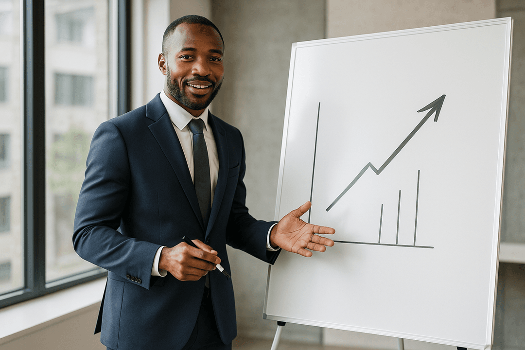 Prompt: A photorealistic image of a confident businessperson presenting a strategy on a whiteboard in a modern office setting. The board shows an upward arrow and one simple chart. Natural lighting, neutral tones, and a sense of energy and purpose.