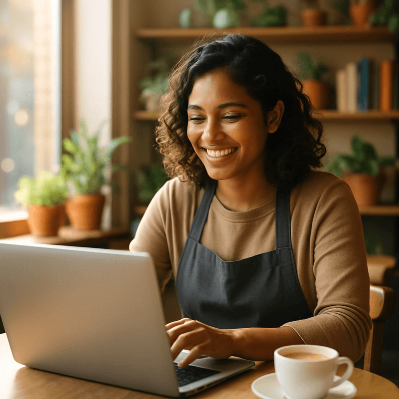 Prompt: A photorealistic image of a smiling small business owner working on a laptop at a cozy café table, with soft morning sunlight streaming through the window. The background shows shelves with plants and books, creating a warm and inviting atmosphere. Bright, natural colors, shallow depth of field, clean and inspirational composition