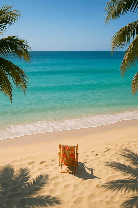 Prompt: Photorealistic wide overhead shot from behind, showing a small beach chair with a colorful summer dress draped over it, placed on a sunny, sandy beach. The chair appears small in the frame, surrounded by open beach, with a vast turquoise ocean taking up most of the background. Palm trees frame the edges. Bright natural sunlight, shallow depth of field focused loosely on the beach area. 8K UHD. Inviting, tropical atmosphere.