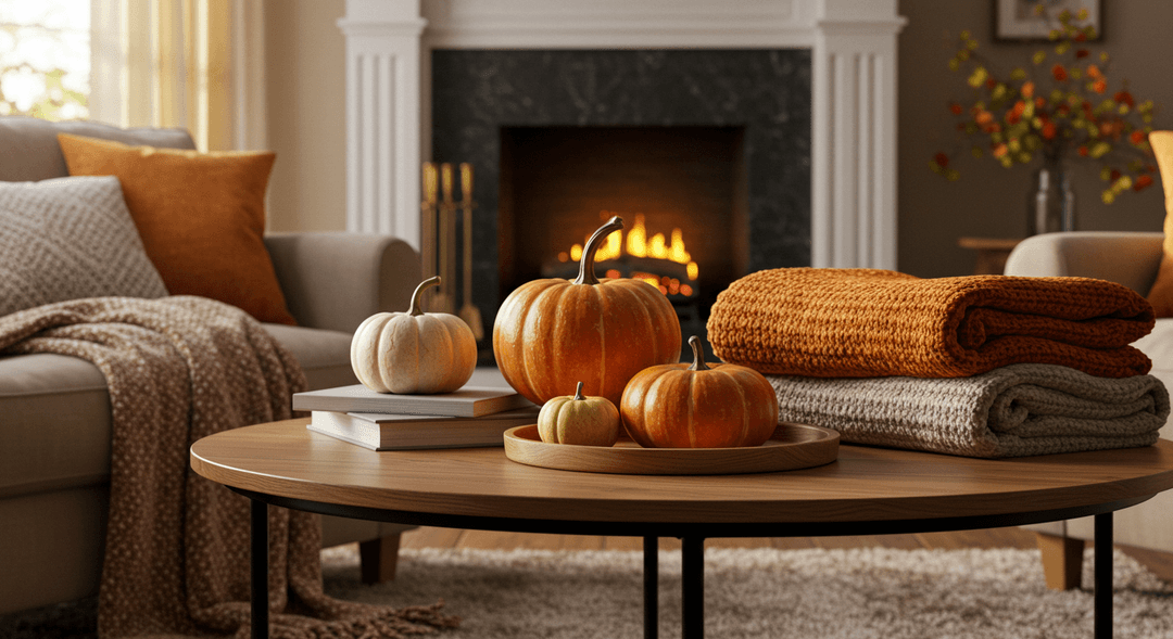 Prompt: Photo for a blog post about 'Autumn Home Decor Tips,' a cozy living room scene with a fireplace, soft blankets, and decorative pumpkins on a coffee table. Warm, golden hour lighting. Inviting, comfortable composition. Rich, autumnal color palette of oranges, reds, and deep greens. Photorealistic.